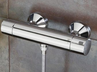 • Термостатические смесители, включающие, помимо обязательных элементов, лейку для душа, слив и переключатель. Изделие может иметь разную форму, чаще всего – трубчатую систему, оканчивающуюся переключателями.