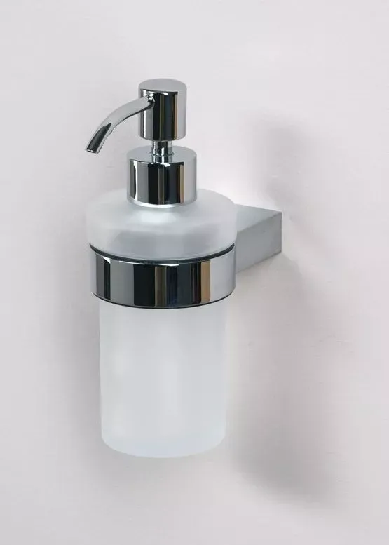 Дозатор для жидкого мыла Aquanet 5681-J из матового стекла больше напоминает стильный флакон для парфюмерной воды. Предусмотренное для него массивное крепление к стене перетекает в широкое кольцо, в котором надежно установлена емкость дозатора. Объема жидкого мыла, помещающегося в нем, хватит на длительное время. Такая практичная и в то же время продуманная вещь будет хороша в интерьере, оформленном в любом стиле, а ее хромированная часть будет аккомпанировать по цвету и стилю со смесителем.