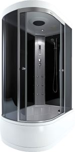 поддон высокий 50см фронтальные стекла серые тонированные задние стекла черные центральная панель пластик «серебро» хромированный алюминиевый профиль регулируемые ролики хромированные ручки для дверей 3-х режимный смеситель ручная лейка на штанге 6 гидромассажных форсунок верхняя лейка «тропический душ» стеклянная полка