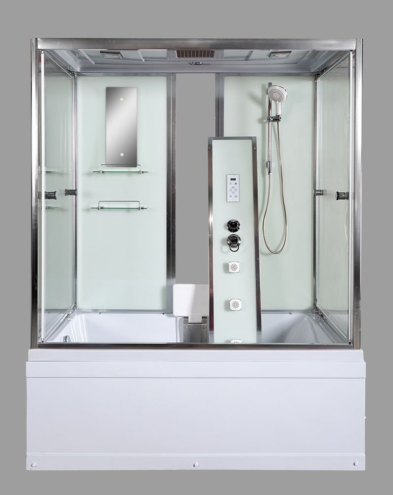 Стильная душевая кабина с внутренней сборкой AvaCan V170 сочетает в себе высокую функциональность, практичность и надежность. Для изготовления применяют безопасное закаленное стекло толщиной 5 мм, надежно фиксируемое алюминиевым профилем. Цвет профиля хром. В комплекте зеркало, сенсорный пульт управления, передний съемный экран, донный клапан (клик-клак), душевой гарнитур, тропический (верхний) душ, полочки, откидное сиденье, гидромассажные форсунки, смеситель, переключатель режимов, тропический (верхний) душ, вентиляция, радио.