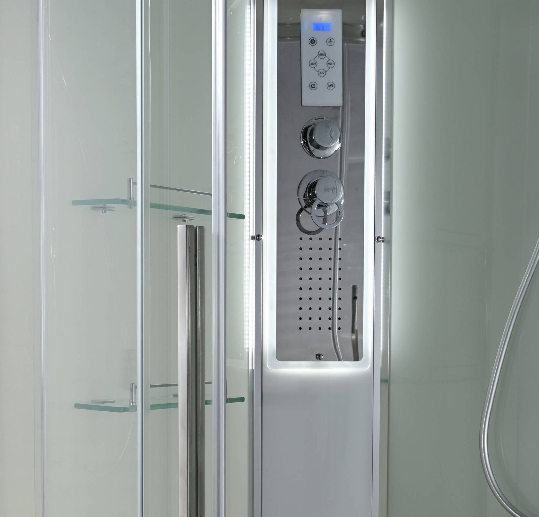 Стильная душевая кабина AvaCan EM2812LLEDT сочетает в себе высокую функциональность, практичность и надежность. При изготовлении применяется безопасное закаленное стекло толщиной 5 мм (прозрачное), надежно фиксируемое алюминиевым профилем. Сборка без силикона (увеличивает срок службы), внутренняя сборка(облегчает установку и ревизию; позволяет установить в ограниченном пространстве), смеситель резьбовой (без хомутов). Съемный экран поддона (позволяет осуществлять ревизию сифона). Цвет профиля хром. Двойные металлические ролики дверей (увеличивают срок службы).В комплекте : душевая штанга, две полочки , тропический (верхний) душ, арома-лейка с витамином С (картридж съемный),полимерная вставка в поддон(имитация дерева),сифон, ручки дверей из нержавейки , двойные ролики ,пульт сенсорный(Блютуз ,LED подсветка ,радио ,вытяжка),гидромассаж спины.