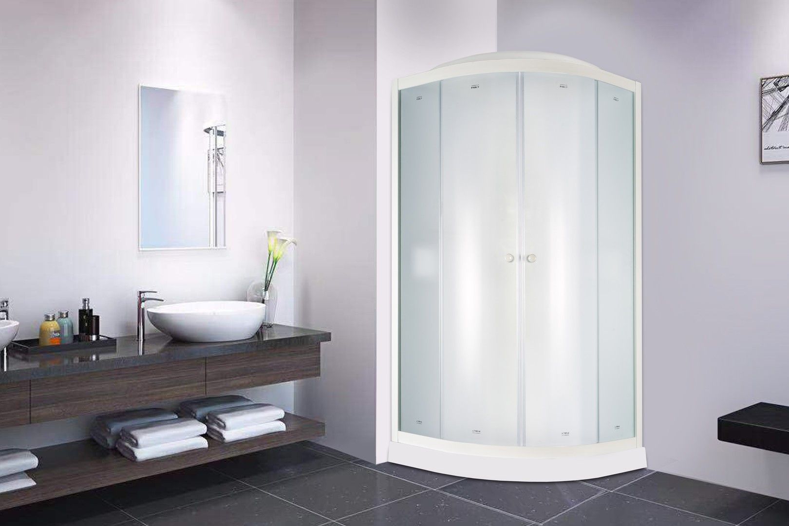 • Закаленное стекло толщиной 4 мм практически невозможно разбить. Матовое полотно не требует часто чистки. Сквозь стекло можно рассмотреть только контуры тела.
