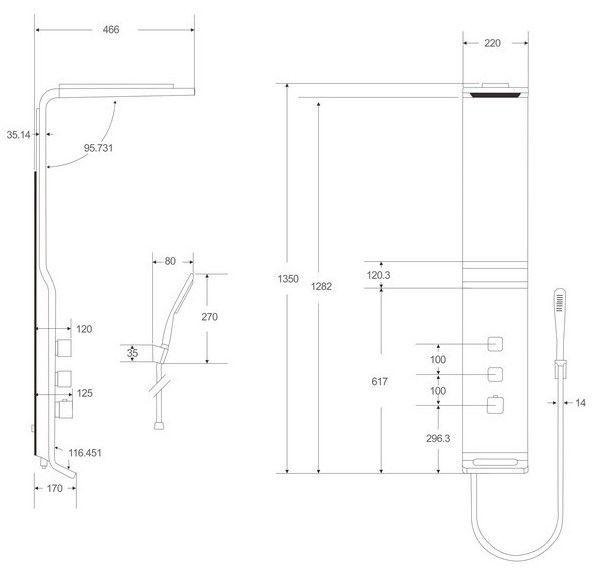 - Комплектация: душевая панель, душевая лейка, смеситель, шланг для душа, термостат, крепеж, инструкция