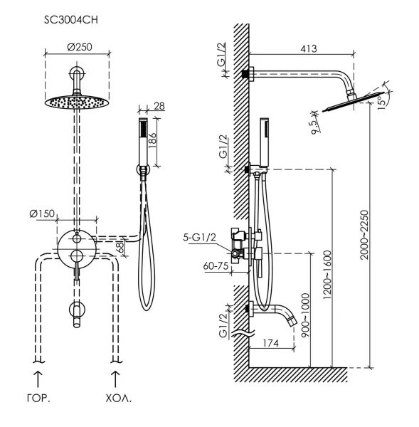 Душевой комплект SANCOS Select встраиваемый для ванны/душа, с внутренней частью, верхним, ручным душем, изливом и шлангом в комплекте, цвет хром, арт. SC3004CH