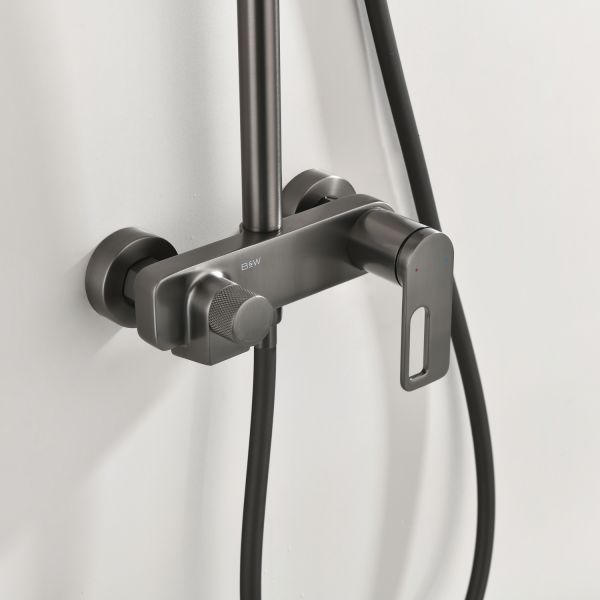 Душевая стойка производителя Black&White в цвете оружейная сталь. Корпус изделия изготовлен из сантехнической латуни, материал высокоресурсный и безопасный для здоровья. Управление потоками воды осуществляется с помощью керамического картриджа повышенной пропускной способности. Из потребителей на стойке установлен верхний душ, ручная лейка с режимами и излив, интегрированный в фронтальную часть корпуса. Для выбора режима работы установлен поворотный механический дивертор цилиндрической формы с насечками на корпусе для удобства использования мокрыми руками. Простые геометрические линии продукта гармонично встроятся в лаконичные интерьеры ванной комнаты.