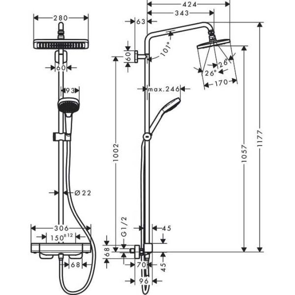 HG Croma E 280 1jet Душевая система Showerpipe с термостатом для душа, хром 27630000.Оснащение: душевая лейка, душевая штанга, душевой шланг, кронштейн для верхнего душа.