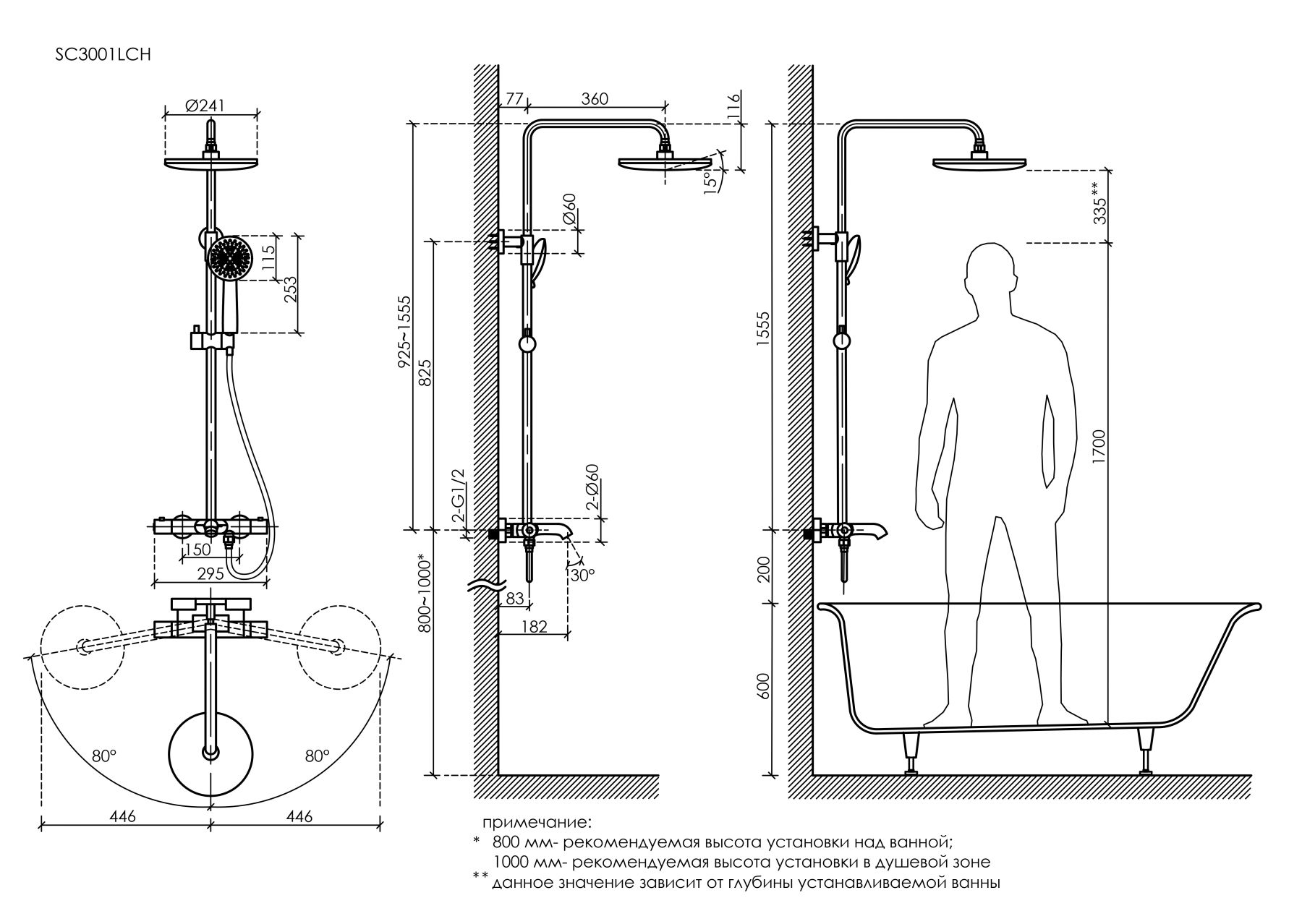 • Подходит для установки над ванной и в душевую зону