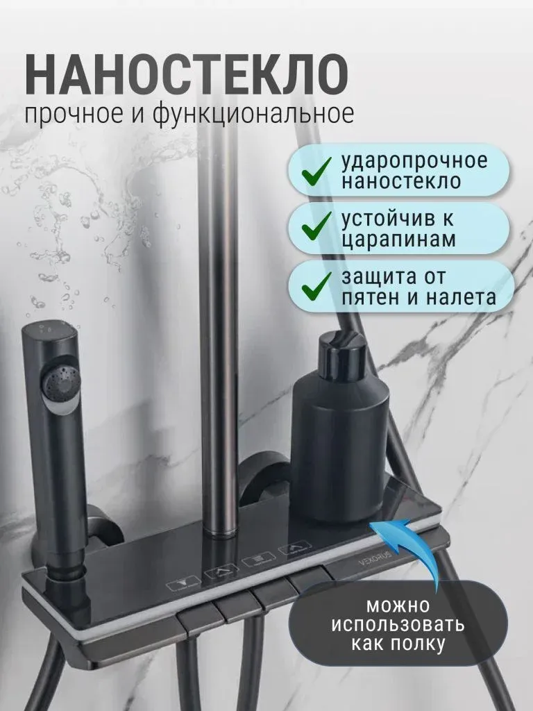 Душевая система с тропическим душем Vexorus - это система, которая превратит вашу ванную комнату в настоящий уголок роскоши и комфорта. Изделие выполнено в графитовом цвете, что позволяет гармонично его использовать в современном интерьере.