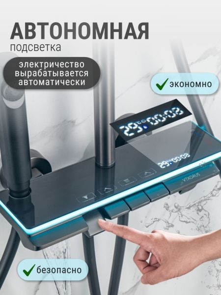 Душевой комплект содержит все необходимое для монтажа. Кроме того, наша душевая стойка с дисплеем и подсветкой имеет простой и быстрый монтаж, благодаря чему вы сможете установить ее самостоятельно без привлечения специалистов. Это позволит сэкономить время и деньги, а также получить удовольствие от процесса создания своего уютного уголка в ванной комнате.