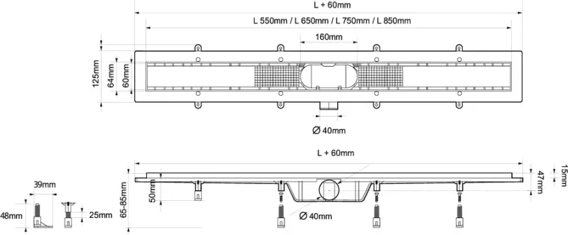 В комплект поставки входит гидроизоляционная лента для обеспечения надёжной защиты от протечек. Процесс обслуживания сифона значительно упрощается благодаря съёмным декоративной решётке и фильтру-сетке, предназначенному для улавливания волос и мусора. Установка лотка облегчается благодаря регулируемым по высоте опорам. Выпускное отверстие имеет горизонтальную ориентацию и диаметр 40 миллиметров.