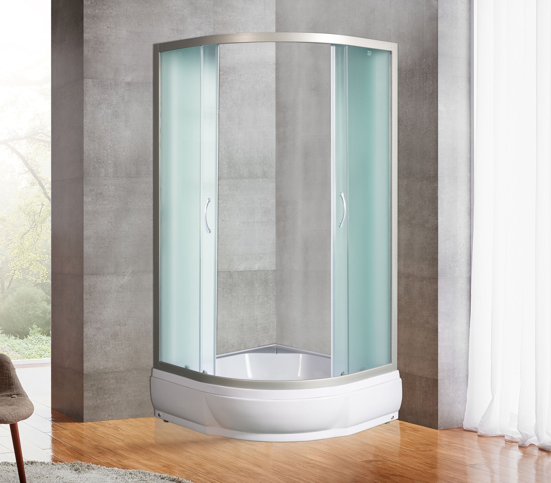 Типы и размеры:без поддона 80*80*185с поддоном 80*80*211 Матовое стекло, профиль матовый хромДушевое ограждение для ванной комнаты полукруглое с боковым регулировочным профилем и саморегулирующимися металическами, хромированными, двойными роликами.