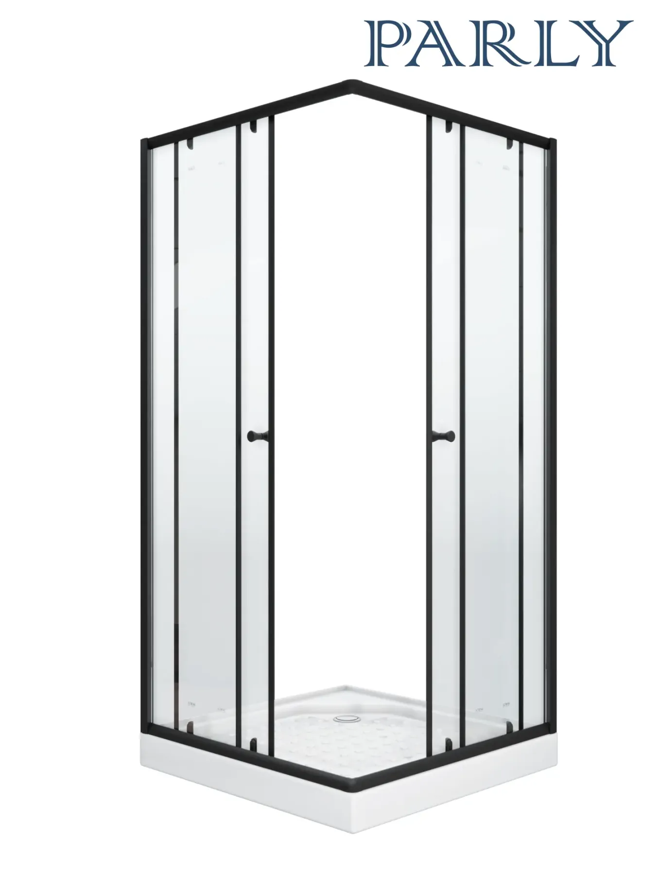 Душевой уголок Parly ZQ81B 80x80 смРазмер: 80х80х190 смКомпактная стильная модель с угловым входом. Прямые черные линии в сочетании с прозрачным стеклом подчеркивают современный дизайн. Раздвижные двери на одинарных роликах ходят плавно, не соскакивают с направляющих.Достоинства:Поддон белый из ABS-пластика, квадратный, с бортиком по периметру;