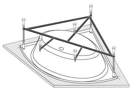 Усиленный цельносварной стальной каркас для прямоугольной ванны изготовлен из квадратного металлического профиля 2х2 см и окрашен темно-бронзовой молотковой краской. Каркас имеет 8 ножек и 4 опоры в борт ванны снизу. Предназначен для использования во влажных помещениях.