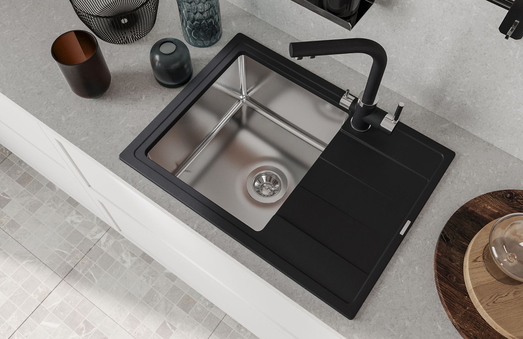Цвет грей (серый) подходит к столешницам разных цветов от светлых до темных, отлично будет сочетаться грей на темных столешницах.
