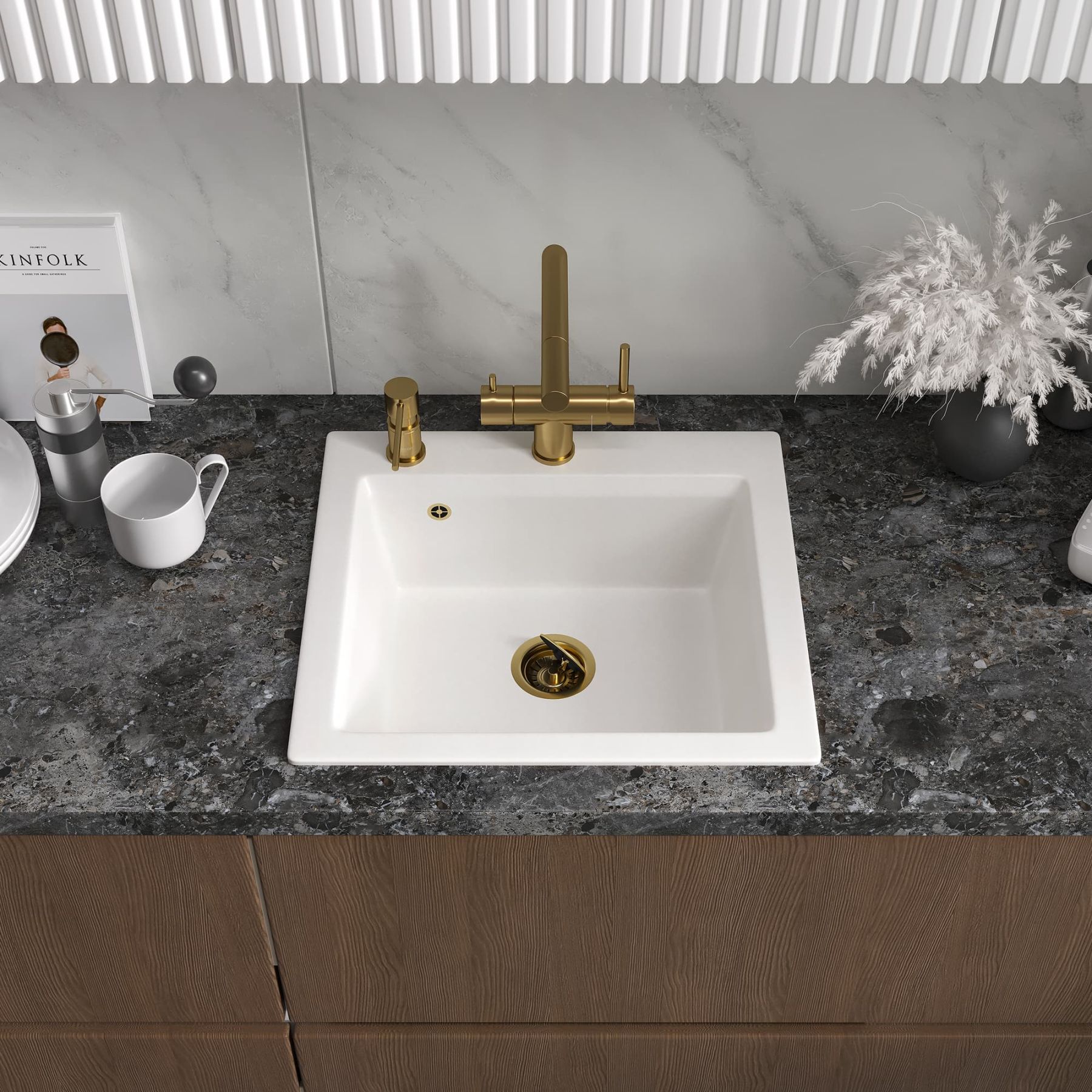 В мойке предусмотрено отверстие для установки смесителя. Используя алмазную коронку, можно сделать дополнительные отверстия для дозатора жидкого мыла или сифона с полуавтоматом.