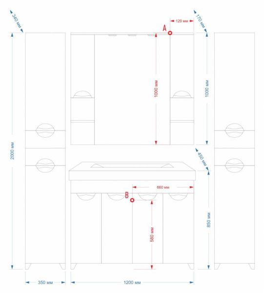 2. Большим зеркалом, которое для четкости отражения оборудовано сверху встроенными в верхнюю панель светильниками, а по бокам – шкафчиками и расположенными под ними открытыми полочками.