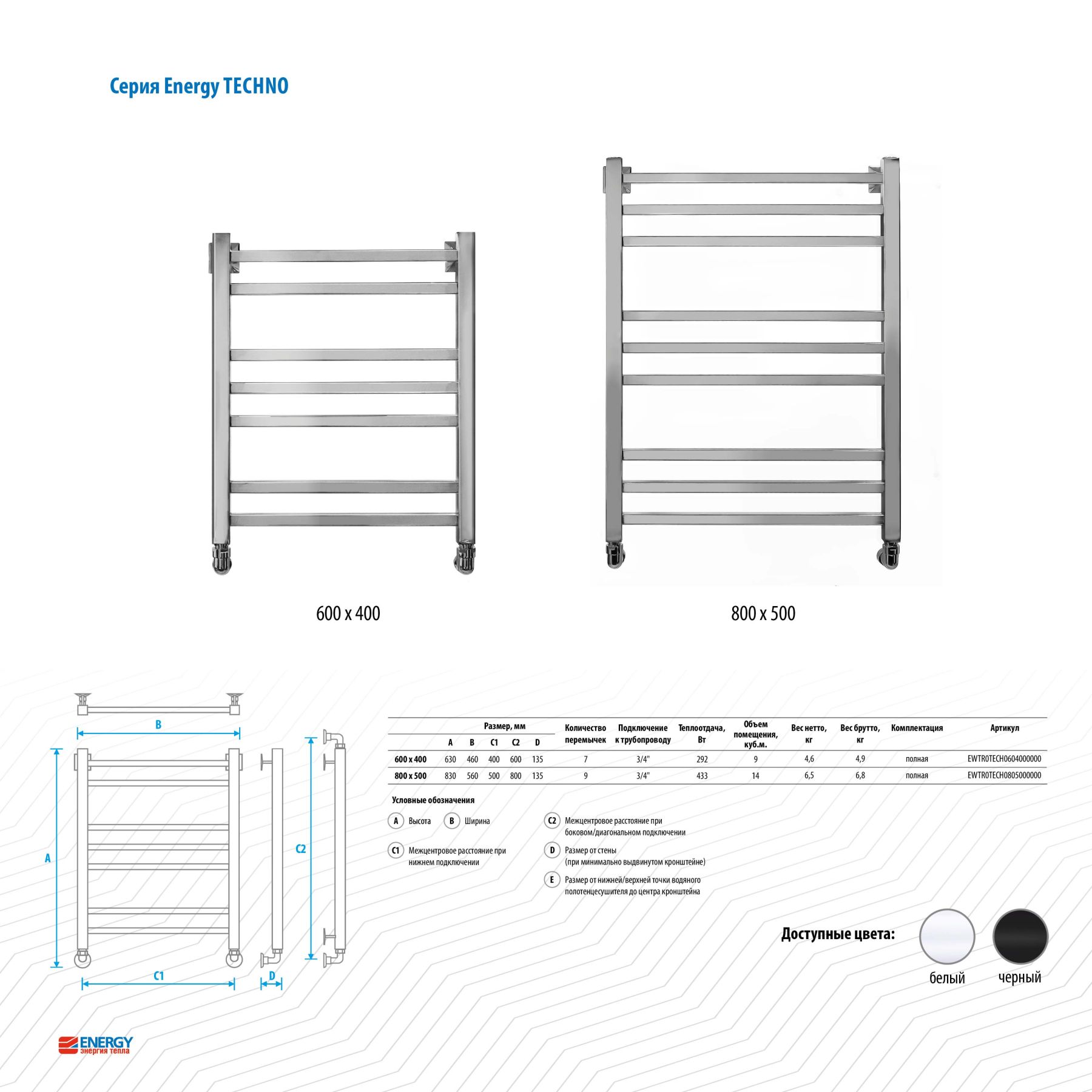 Полотенцесушитель водяной Energy Techno 800x500 RAL 9005 () - лесенка в современном стиле "техно" с необычными перемычками квадратного сечения, выполненная из нержавеющей стали. Используется во всех системах горячего водоснабжения и отопления с рабочим давлением 3 - 15 атм при температуре теплоносителя до 105°С.Межцентровое расстояние: 800 мм (+/-5 мм) при боковом и диагональном подключении, 500 мм (+/-5 мм) при нижнем подключении.В комплектацию входят эксцентрики, позволяющие отрегулировать межцентровое расстояние.Полотенцесушитель изготовлен из высококачественной импортной пищевой нержавеющей стали марки AISI 304 (08Х18Н10). Поверхность изделия окрашена по технологии цветного порошкового напыления - достоинства этой технологии в том, что получаемые изделия прочны, долговечны и экологичны. Сварка швов выполнена по специальной технологии TIG по международному стандарту EN 10217-7. Полотенцесушитель испытан при давлении 50 атм, составляющая его труба — 150 атм, благодаря чему имеет большой запас прочности.Произведен в России. Гарантийный срок - 5 лет.