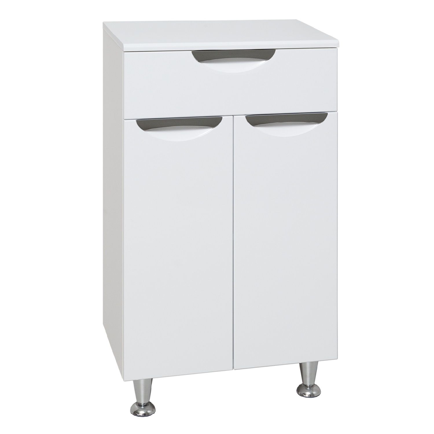 Тумба в ванную (полупенал) с одним выдвижным ящиком и двумя распашными дверками, за которыми одна встроенная полка. Петли со встроенным доводчиком, ручки врезные - 3шт, ножки хром - 2шт, ножки пластик -2шт.