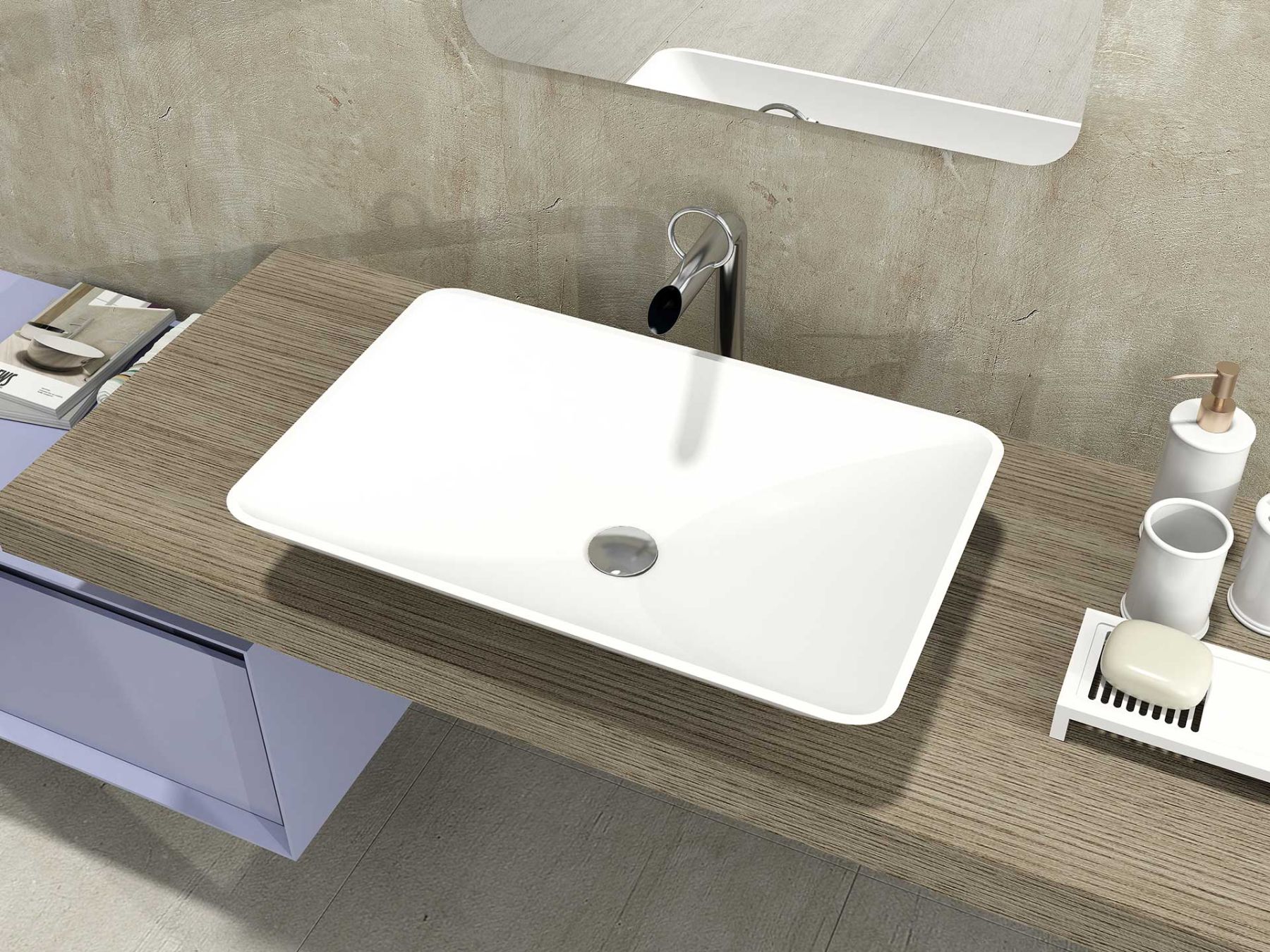 Раковина из искусственного камня для ванной комнаты. Легкая и «воздушная». Востребованной прямоугольной формы. Устанавливается на поверхность столешницы или мебели сверху накладным способом. Дно чаши не плоское, вода по стенкам беспрепятственно стекает в сливное отверстие до последней капли – вода не застаивается после активного использования.Stelvio Quattro имеет матовую, бархатистую поверхность. Полимерный материал принимает температуру окружающей среды, поэтому в жилом пространстве данная модель раковины всегда будет приятной на ощупь.Уход за раковиной из искусственного камня прост: в большинстве случаев достаточно протереть поверхность влажной губкой с чистящим средством. Материал не впитывает влагу, не порист, непроницаем для плесени, бактерий и грибков.