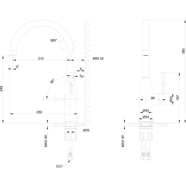 • Высота смесителя: