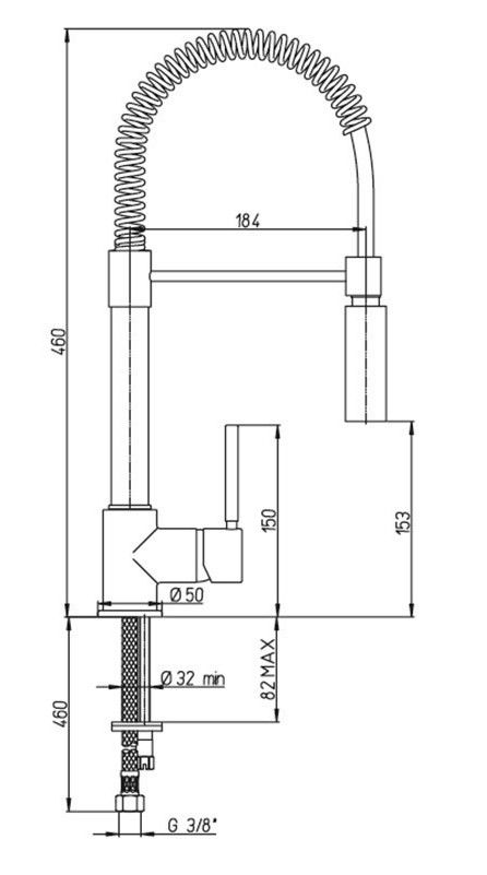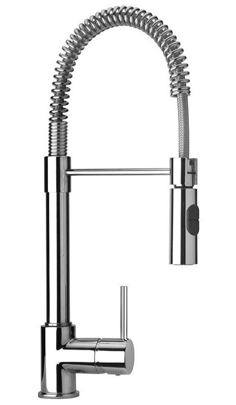 • Высокий корпус, лейка с двумя режимами подачи воды, пружина вокруг шланга, придающая устойчивости изливу.