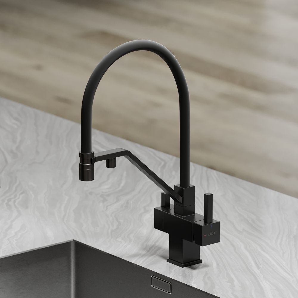 Смеситель для кухни SANCOS Loro с гибким изливом и возможностью подключения фильтра для воды, цвет матовый черный, арт. SC4007MBФункция "Холодный старт" - при включении смесителя активируется холодной поток, для экономии горячей водыАэратор, гибкая подводка, ключ и крепления для монтажа
