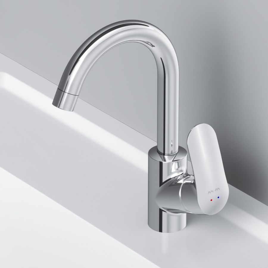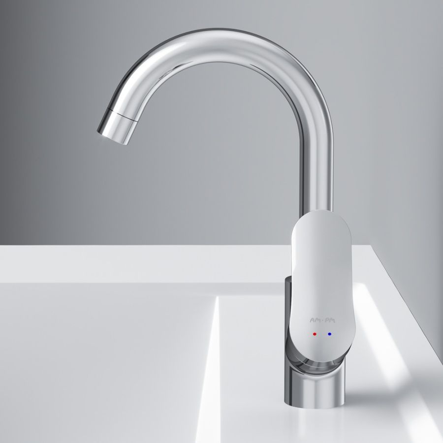 в котором учтены все детали: благодаря уникальной форме ручки капли воды скатываются, предотвращая образование налета, а не высыхают на поверхности.Эксклюзивная разработка: специально спроектированный для АМ.РМ керамический картридж SoftMotion 35 мм обеспечивает оптимальную регулировку температуры, а также позволяет выдерживать любые перепады давления. Высокий излив придает смесителю утонченный