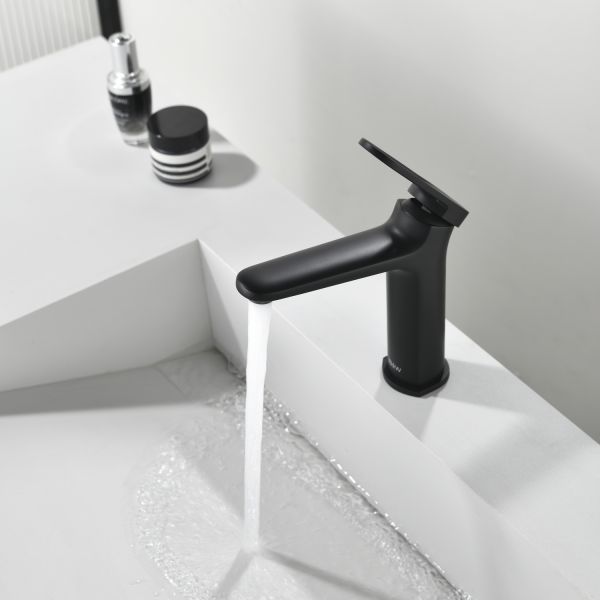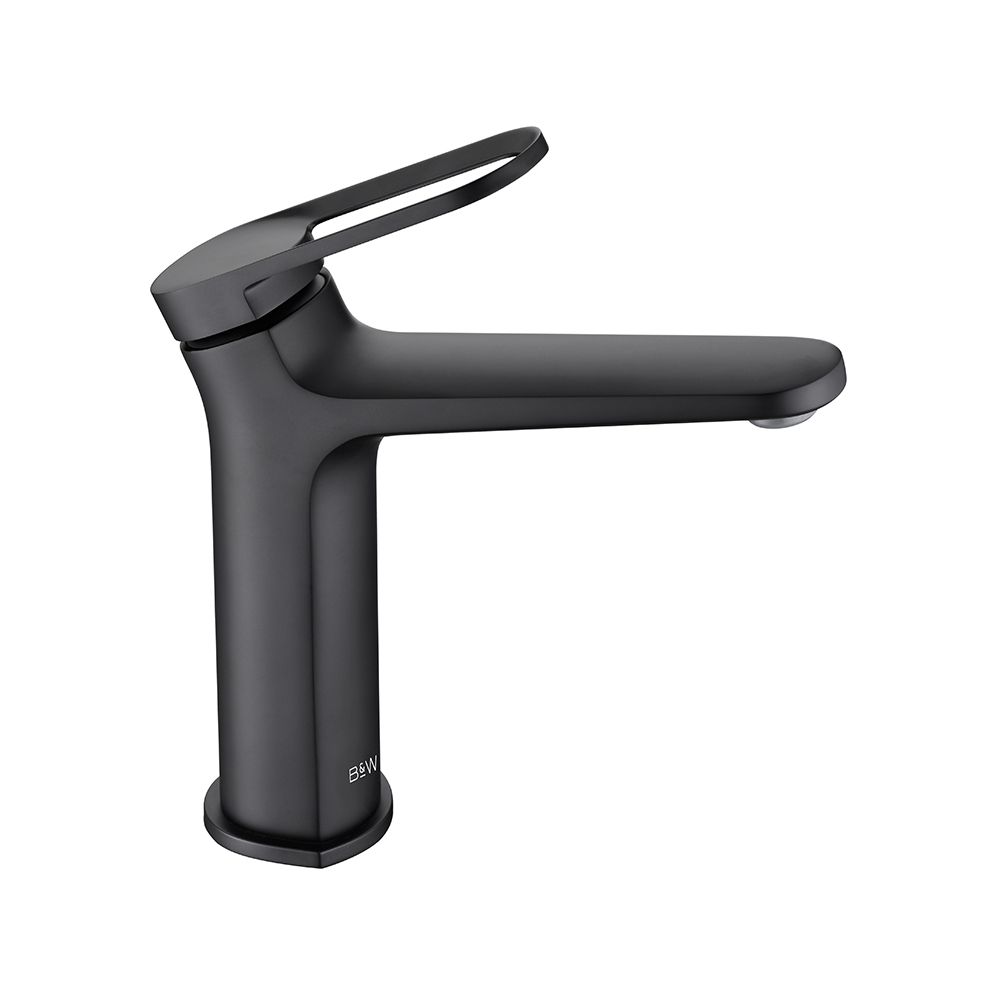 Смеситель для раковины датского производителя Black&White черного матового цвета. Материал корпуса – сантехническая латунь, безопасный для здоровья и ресурсный сплав, с порошковой окраской. Управление потоками воды и настройка температуры осуществляется с помощью керамического картриджа.Важным функциональным и эстетическим решением стоит отметить возвышение излива на 10 градусов  и ручки управления на 25 градусов относительно плоскости– это создает стремительные линии, а также минимизирует количество подтеков на корпусе когда Вы моете руки .