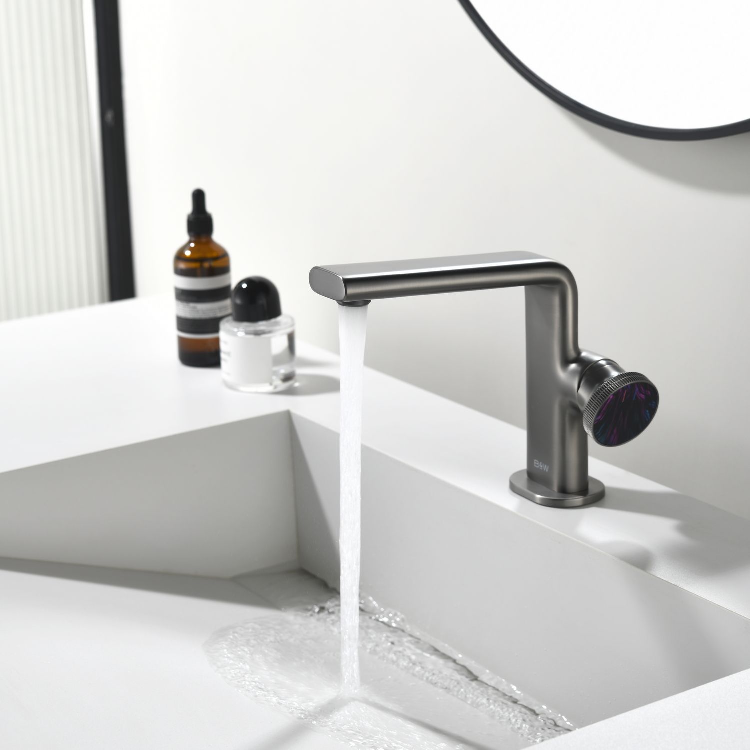 Смеситель для раковины датского производителя Black&White в цвете оружейная сталь. Корпус изготовлен из сантехнической латуни марки HPB 53– безопасного для здоровья сплава из олова цинка и меди. На изделии установлен картридж прогрессивной конфигурации, без возможности регулировки давления в полном диапазоне, доступна регулировка температуры для удобства настройки и экономии воды. Для включения используется ручка в форме диска с насечками и ярким цветовым дополнением.В дизайне продукта используются лаконичные прямоугольные формы со скруглением, которые гармонично дополнят многие современные интерьеры ванных комнат.