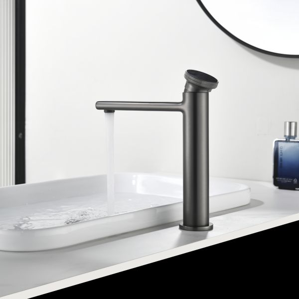 Смеситель для накладной раковины датского производителя Black&White в цвете оружейная сталь. Материал корпуса – сантехническая латунь марки HPB 59,безопасный для здоровья и высокоресурсный сплав.Для  настройки температуры  установлен керамический картридж прогрессивного типа– давление выдается постоянным , а температура выставляется с помощью круглой ручки с насечками расположенной сверху корпуса. В изделии пересекаются цилиндрические и прямоугольные формы, которые гармонично вольются в современные интерьеры ванных комнат.