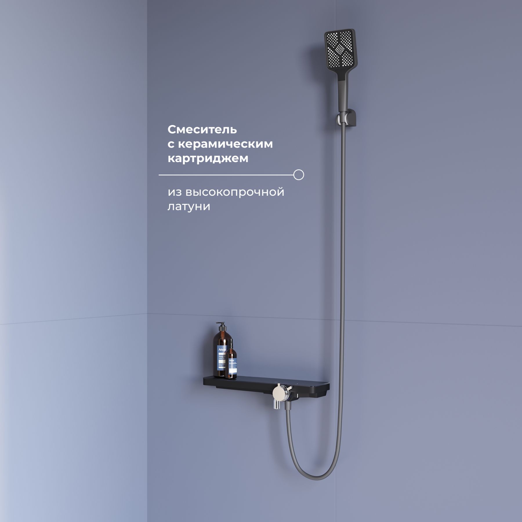 В футуристическом дизайне: корпус изделий выполнен в виде вместительной и удобной полки для душевых принадлежностей, а наличие удлиненного поворотного излива с шарнирным соединением позволяет регулировать направление воды, для максимального комфорта в процессе использования.