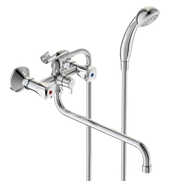 PRACTIC Смеситель для ванны/душа, трубчатый поворотный излив 320 мм с керамическим переключателем, душевой гарнитур в комплекте (душевая лейка Ø70 мм, металлический шланг 1500 мм, держатель для лейки).Смеситель двухрычажный