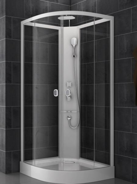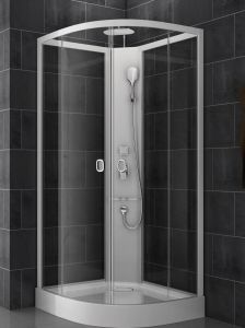 Полукруг, без пара. без крыши, с акриловым поддоном высотой 150 мм, верхним и ручным душем, стекла 8мм прозрачные, но по желанию могут быть тонированные, матовые, белые. Без гидромассажа спины. Простая и быстрая установка, сборка без силикона.