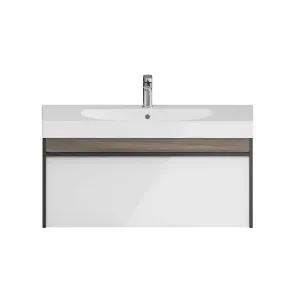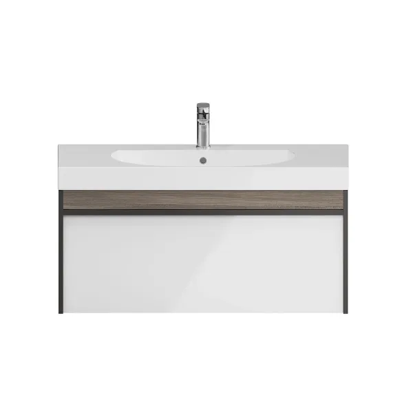 Мебель MODULA может быть использована для установки как мебельных раковин, так и любой из накладных, которые в этом случае устанавливаются на керамическую столешницу CANALETTO. Боковины тумбы выполнены в цвете «Арабика», фасад — белый глянцевый.