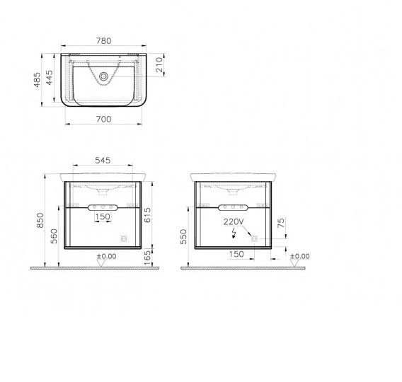 Шкаф Sento с раковиной, с 2 ящиками, 80 см, с LED подсветкой, цвет матовый антрацит ( ножки 610... Подробнее