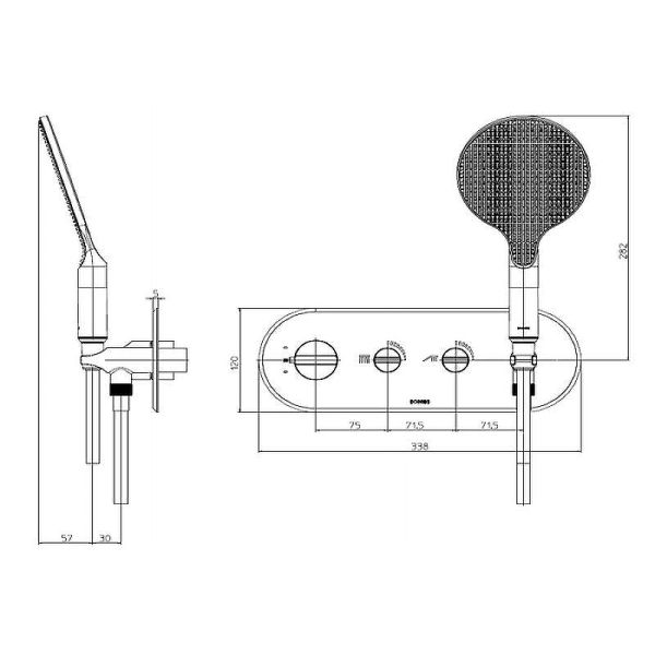 Bossini Apice - это современный термостат, оснащенный двумя вентилями. Он прекрасно подходит для создания комфортной душевой зоны. В комплекте идет душевая лейка диаметром 140 мм с фиксированным держателем и шланг Cromolux длиной 150 см.