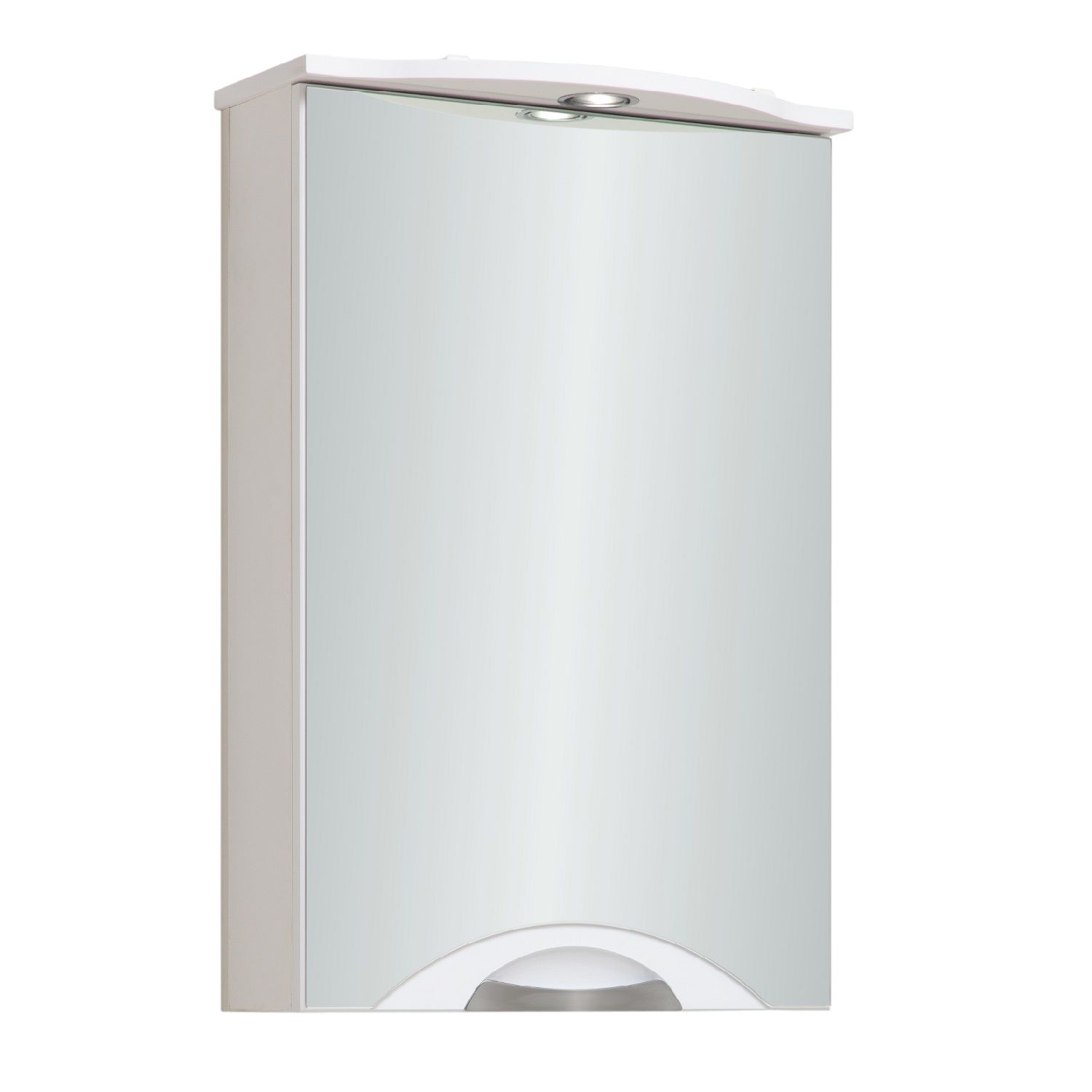Зеркальный шкаф оборудован одним врезным светодиодным светильником 220В и розеткой с выключателем. Шкаф с распашной зеркальной дверцей, на которой расположена врезная ручка. Внутри шкафа - две встроенные полки. Петли со встроенным доводчиком, ручка -1 шт. Выпускается только в правом исполнении.