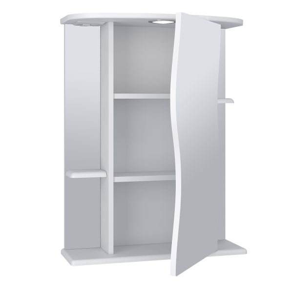 Зеркальный шкаф оборудован одним врезным светодиодным светильником 220В и розеткой с выключателем. По центру - шкаф с фигурной зеркальной дверцей и двумя внутренними полками, справа и слева - по одной открытой полке. Петли с доводчиком. Выпускается только в правом исполнении.