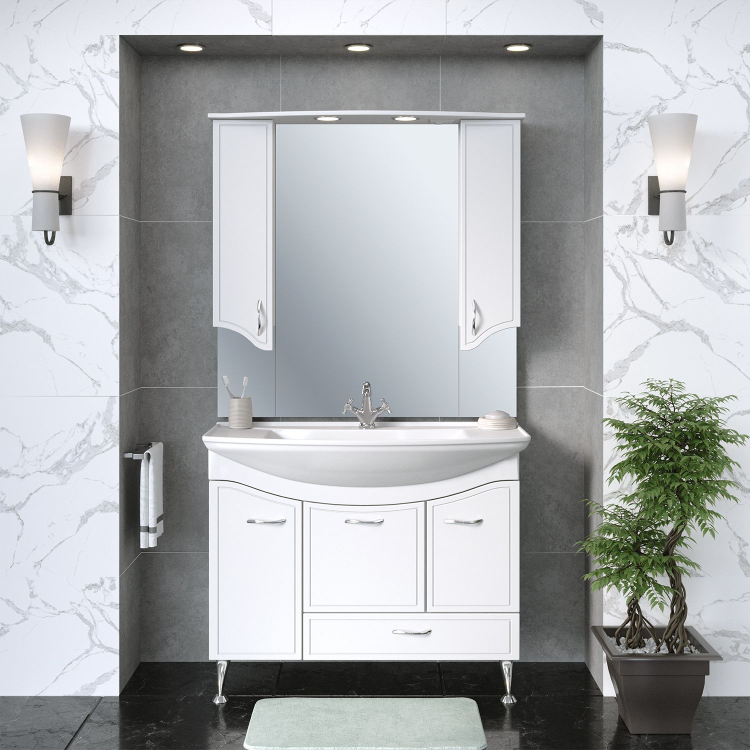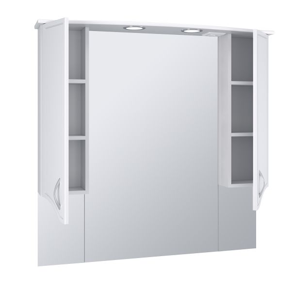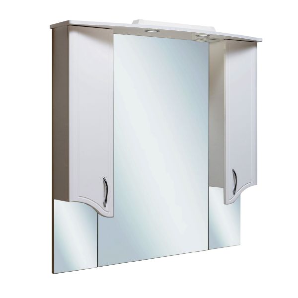 Зеркальный шкаф оборудован двумя врезными светильниками 220В и розеткой с выключателем. Справа и слева - шкафчики с распашными фасадами и двумя внутренними полками в каждом. Петли со встроенным доводчиком, ручки - 2шт.